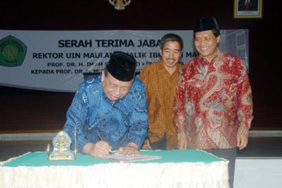 GEMA-Serah Terima Jabatan (Sertijab) rektor UIN Maliki diliputi rasa haru, Sabtu (4/5). Bertempat di aula rektorat lt.5, rektor lama dan baru masing-masing didaulat menyampaikan pidatonya. Acara didahului dengan penandatanganan Sertijab oleh Prof. Dr. H. Imam Suprayogo, rektor lama, dan Prof. Dr. H. Mudjia Rahardjo, M.Si., rektor baru. Disaksikan seluruh pejabat, karyawan dan perwakilan mahasiswa UIN Maliki, Imam Suprayogo menyampaikan kesannya selama 16 tahun menjabat rektor.