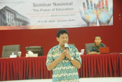 Gema-Fakultas Humaniora gelar Seminar Nasional bertema “The Power of Education” (9/9). Seminar yang mengundang Prof. Dr. Djoko Saryono, M.Pd sebagai narasumber tersebut di gelar di Gedung rektorat lantai 5. Seminar yang dibuka langsung oleh rektor UIN, Mudjia Rahardjo itu akan fokus pada mempersiapkan Sumber Daya Manusia (SDM) yang kompetitif dalam menyongsong ASEAN Community 2015. Dalam sambutannya, rektor yang baru diangkat tersebut menerangkan betapa pentingnya integrasi antara ilmu pengetahuan dan agama untuk menghadapi era globalisasi ini. “Integrasi inilah yang menjadi ciri utama dari UIN Maliki Malang.” terangnya.